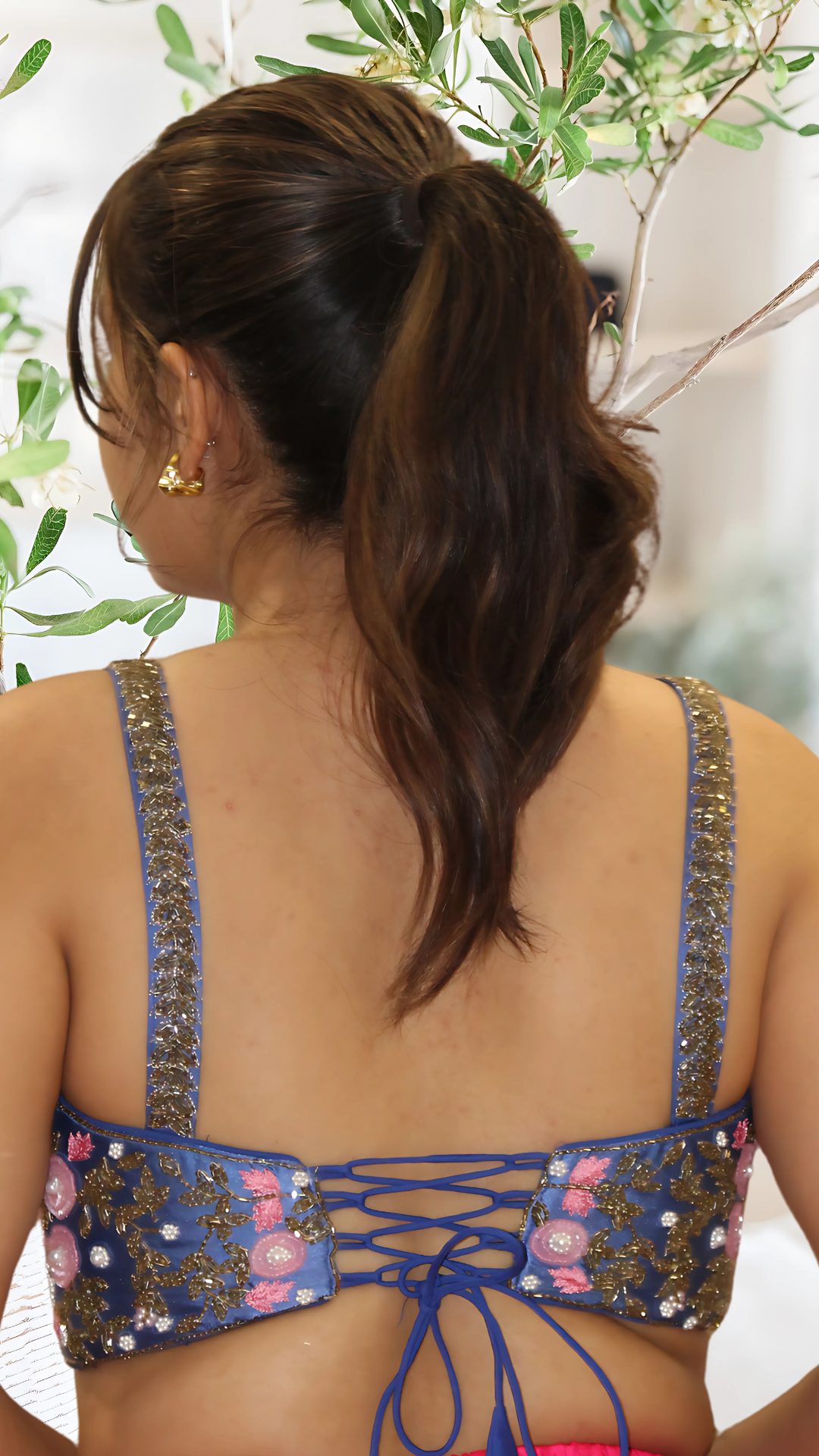 Elevate your ethnic wardrobe with this Royal Blue Readymade Designer Blouse, designed for women who love timeless elegance with a touch of sparkle. Adorned with antique cut dana work, multicolour sequin accents, resham thread embroidery, and delicate pearl highlights, this blouse is handcrafted to perfection. The dori closure at the backadds a graceful finish, ideal for styling with sarees, lehengas, or festive skirts. With a chest size 36, expandable to 38, it offers both a flattering fit and luxurious flair—perfect for weddings, parties, or festive occasions.
